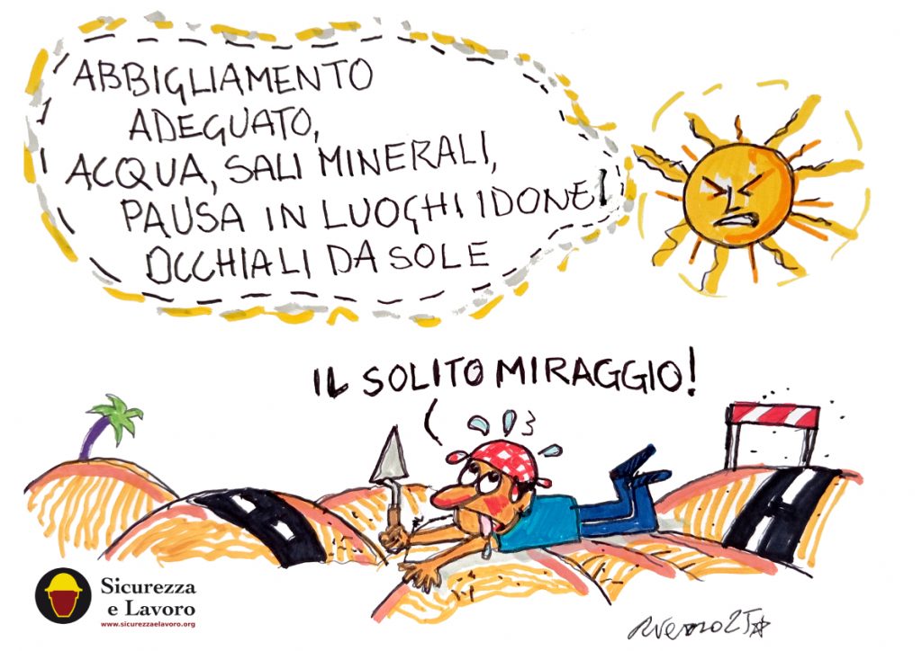 Il settore delle costruzioni, insieme all’agricoltura e al florovivaismo (ma non dimentichiamoci della logistica e dei rider), è sicuramente tra quelli più esposti ai rischi derivanti da stress termico e radiazioni solari. Ed è quindi fondamentale fare una seria opera di prevenzione per ridurre i rischi legati alle ondate di calore: salute e sicurezza sul lavoro non devono essere un miraggio, come ci ricorda ironicamente la vignetta di Tiziano Riverso, il cartoonist di Sicurezza e Lavoro, ospitata in questo numero di Safety First.